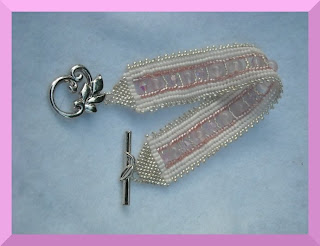 I finished another bracelet , in whites and pinks and silver. I like it very much and that is surprising as I am not a girly girl. I really would love to know what YOU all think though, so if you would not mind please let me know what you think of my beads, what I can ch ange or improve on. I would very much appreciate the constructive feedback.